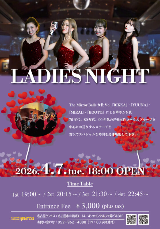 - 息の合った演奏とクオリティーの高いステージ、またヴォーカル二人によるデュエットナンバーで、ご来場の皆様にひと時の魔法をかけます。私たちミラーボールズ、そして名古屋KENTO'Sは名古屋を代表するエンターテイメント空間を目指しています。是非ご来場いただき、生の演奏をお楽しみください。